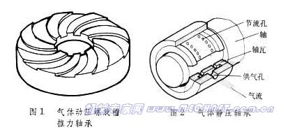类型 气体润滑轴承形成承载气膜的机理与液体润滑轴承相同,故也分为气体动压轴承和气体静压轴承。按承受载荷的方向不同,又可分为气体径向轴承、气体推力轴承和气体径向推力组合轴承。气体动压轴承是利用气体在楔形空间产生的流体动压力来支承载荷的。常在轴颈或轴瓦的表面做出浅螺纹槽,利用槽的泵唧作用提高承载能力。图1 [气体动压螺旋槽推力轴承]为气体动压螺旋槽推力轴承。气体静压轴承(图2 [气体静压轴承])的供气压力一般不超过0.6兆帕。气体通过供气孔进入气室,然后分数路流经节流器进入轴承和轴颈的间隙,再从两端流出轴承,在间隙内形成支承载荷的静压气膜。气体静压轴承的内孔表面一般不开气腔,以增大气膜刚度,提高稳定性。